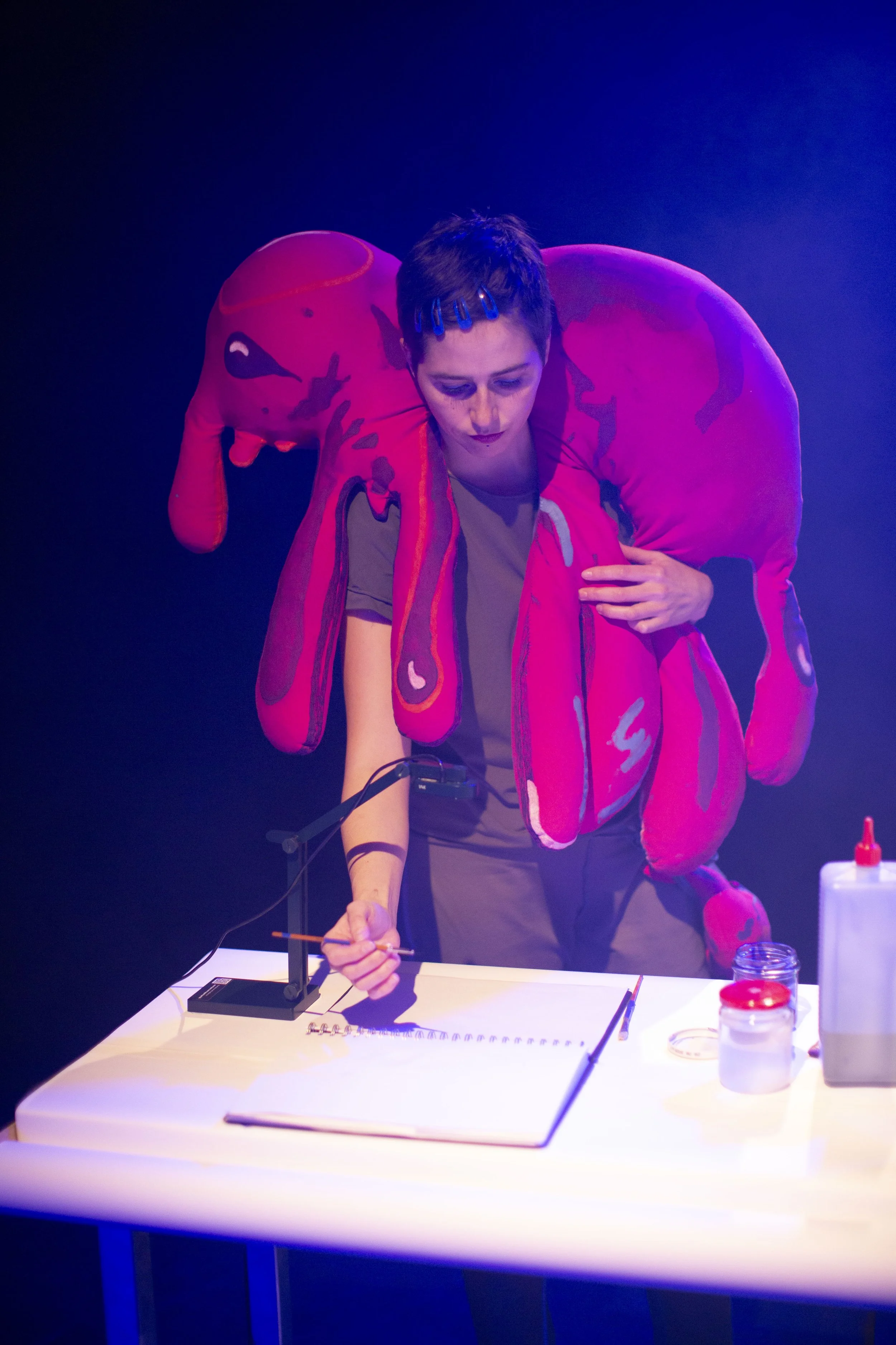 Seit Anfang des Jahres 2024 befragten die Künstler*innen Elly Jarvis, Wael Kh. Salem und Charlotte Bartesch Berliner Kinder und Erwachsene zu blauen Assoziationen. Sie sammelten blaue Geschichten, Zeichnungen zu traurigen Wesen und Ideen, was man bei Traurigkeit machen kann. Aus dem gesammelten Material kreierten sie BLAUPAUSE: Eine interaktive Theateraufführung, bei der die Bühne zu einem sicheren Ort wird, um sich kollektiv mit Traurigkeit und Trost auseinanderzusetzen. Die gezeichneten Bilder der Kinder wurden zur Inspiration für das Bühnenbild genutzt.